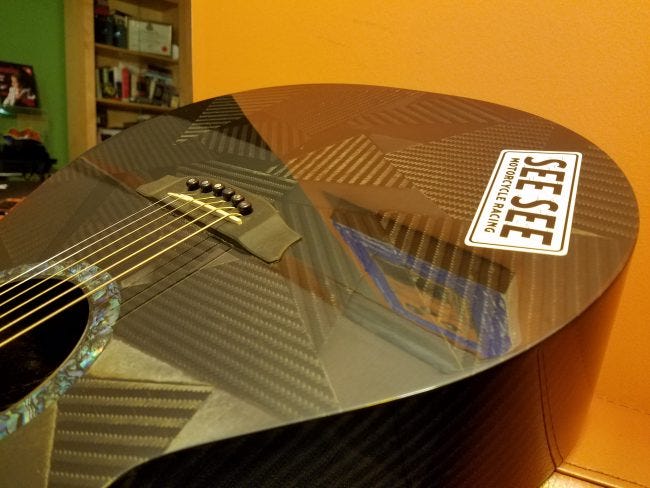 Seventeen months ago, I drove a BMW i8 from Los Angeles to just north of Seattle. My journey ended at the RainSong Guitars shop, where I ordered a "Black Ice" cutaway acoustic-electric. It showed up in August of last year. Since then I've played it between three and eight hours a week. Let's call it two hundred hours total. In all conditions, across the country, dropping and banging it, killing string set after string set, sometimes letting it sit in the California sun where it got too hot to touch and other times (like today) letting it sit in my trunk for a full day's worth of ten-degree weather.