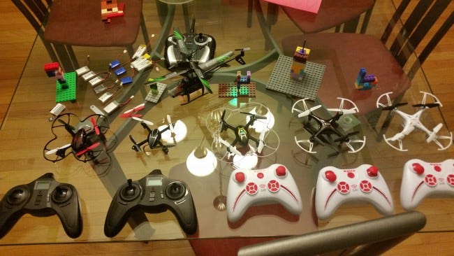 Early last year, I bought a pair of first-generation quadcopters on clearance at my local Micro Center. I flew them around for a while, then let my son try them. He quickly became a better quadcopter pilot than I was --- but he was also a far more daring quadcopter pilot than I was, and we got to the point where I couldn't fix them. I bought him a mini-quad three weeks ago.